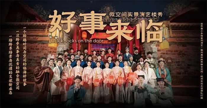 临海西门街的状元第,是《好事来临》的舞台,也是曾是明代状元秦鸣雷的别居。这座被称为“世界最小多维室内演艺”的场馆里,没有传统的舞台界限——说书人摇着折扇从廊下走出,观众或围坐品茶,或与演员沉浸式互动。在“坐定式”与“行进式”的观演模式交替间,游客沉浸式体验以状元文化为叙事背景,通过秦鸣雷的视角所演绎的《他乡遇故知》《金榜题名时》《久旱逢甘霖》《洞房花烛夜》四大人生喜事。